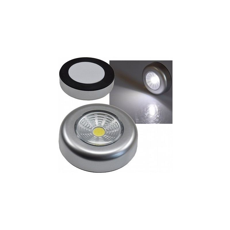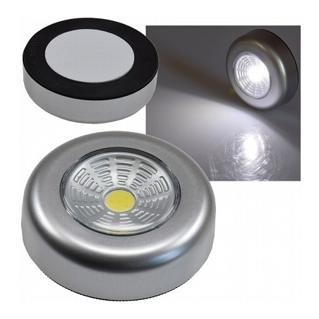 Ob im Kleiderschrank, am Schreibtisch oder im Wandregal: Licht, wo immer Sie es brauchen, netz-unabhängig. Einfaches Ein-/Ausschalten durch Drücken auf die Lampe. Spannung 4.5V, 100% Hell 1 Sek., Betrieb mit 3 x Microbatterie AAA (nicht dabei). LED-Druck- und Klebleuchte "CTK1 COB", 0.7W, 1 COB, 4000K, 50Lm, 3 x AAA Batterien (exklusiv), 6.8 x 2.5, grau, Kunststoff, Mit Klebfolie.