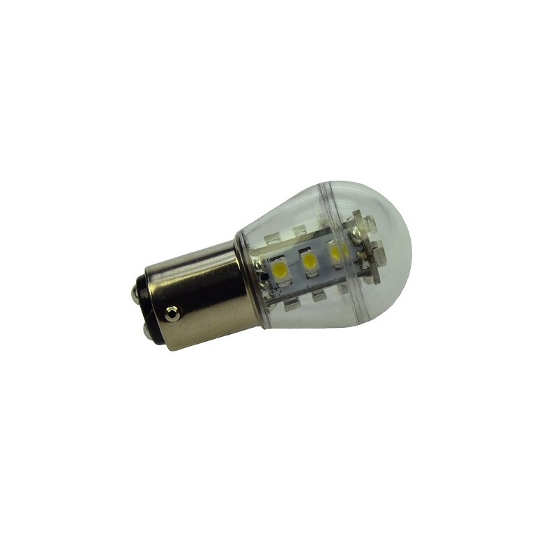 Unsere 12V BAY15d LED-Leuchtmittel mit dem Bajonettsockel sind im Niederspannungsbereich und anzusiedeln (Marine, Boot, Signallampe, Positionslampe, Camping, Wohnmobil usw.). Marine-Polung: +Plus und -Minus auf den 2 unteren Kontakten! Die angenehme Lichtfarbe und die tolle Leistung von 1.6W eignet sich für den universellen Einsatz im 12V (10-30V) Bereich auch für die wohnliche Stimmung (nicht als LKW/KFZ Bremslicht verwendbar). LED Lampe BAY15d/1157, 1.6W, DC10-30V,15 LED's, dim., 12V, 2700K/5000K, 140Lm, 48x15mm, Ersatz 15W, 4.8 x 1.5, 1 x Plus und 1 x Minus unten.