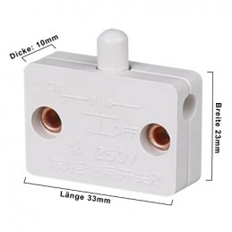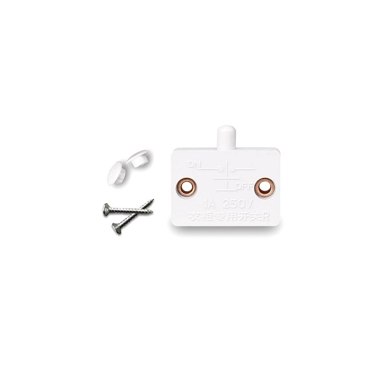 Mit diesem praktischen Schalter bis maximal 250V können Sie Ihre Leuchtmittel, Geräte oder LED Streifen in Schränken ganz einfach durch das Öffnen und Schließen der Tür ein- und ausschalten. Der Schalter funktioniert wie ein Kühlschrankschalter. Sobald die Tür geschlossen ist, schaltet der Türschalter das Licht einfach aus. Anschluss: 0.5 - 1.25mm² Kabel. Kunststoff (feuerhemmendes Material). Schranktür Schalter, EIN/AUS, 1V - 250V, max. 42W, Einfache Besfestigung durch 2 Schrauben, 3.3 x 2.3 x 1.20, weiss, inkl. 2 Holzschrauben.