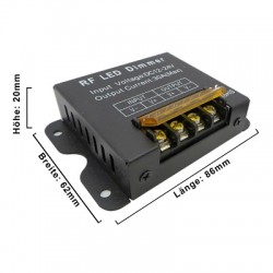 Dieser praktische Dimmer für 12V-24V LED Lampen können Sie mit der mitgelieferten Fernbedienung stufenlos dimmen. Der LED Funk-Dimmer wird nach dem 12V-24V DC LED Trafo angeschlossen und ist für fast alle LED Lampen geeignet. Der Funkdimmer hat eine Reichweite von ca. 20 Metern und kann meist direkt in der Lampe verbaut werden. Auch können können Sie den Dimmer von einem anderen Raum aus steuern, da dieser mit Funk arbeitet und nicht wie andere Dimmer mittels Infrarot. LED-Funkdimmer mit Fernbedienung, 12V DC, 360W, Eingang: 12-24V DC, Ausgang: 12V/24V DC, bis 20m, 9 x 6.2 X 2.0, schwarz, Metallgehäuse, Dimmer mit FB für 12/24V DC.