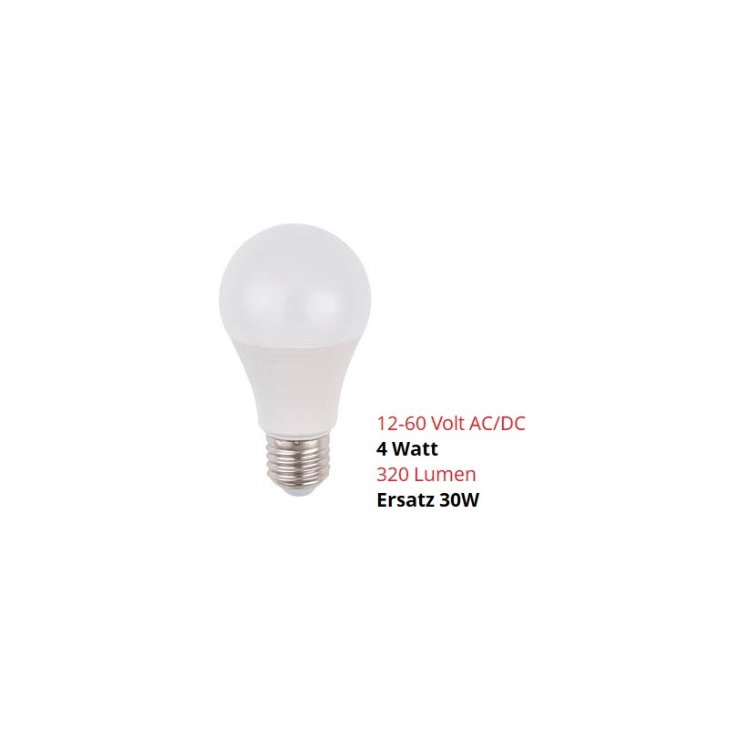 Niedervolt 12-60 Volt DC E27 LED-Leuchtmittel mit dem grossen Schraubgewinde finden Sie im Photovoltaik-, Solar-, Camping-, Caravan-, KFZ, Marine, Industrie Bereich. General VR12-60V Premium Leuchtmittel. Genial bei Stromschwankungen! Diese tollen LED ernergiesparenden Lampen finden Verwendung im Garten, im Wochenendhaus, im Wohnmobil, auf einem Boot usw. Dank der spez. Niedervolt 12V-60V Technik auch für den direkten Batterie- und Solarbetrieb geeignet. LED Lampe, Globe "A60", E27, 12-60V DC, 4W, matt, 12-60V, 3000K, 320Lm, 240 Grad, Ersatz 30W, 11.5 x 6.0, weiss, Aluminium/PC, 12-60V DC.