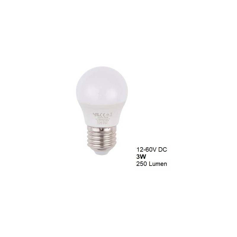 Niedervolt 12-60 Volt DC E27 LED-Leuchtmittel mit dem grossen Schraubgewinde finden Sie im Photovoltaik-, Solar-, Camping-, Caravan-, KFZ, Marine, Industrie Bereich. General VR12-60V Premium Leuchtmittel. Genial bei Stromschwankungen! Diese tollen LED ernergiesparenden Lampen finden Verwendung im Garten, im Wochenendhaus, im Wohnmobil, auf einem Boot usw. Dank der spez. Niedervolt 12V-60V Technik auch für den direkten Batterie- und Solarbetrieb geeignet. LED Lampe, Globe "G45", E27, 12-60V DC, 3W, matt, 12-60V, 3000K, 250Lm, 240 Grad, Ersatz 25W, 8 x 4.5, weiss, Aluminium/PC, 12-60V DC.