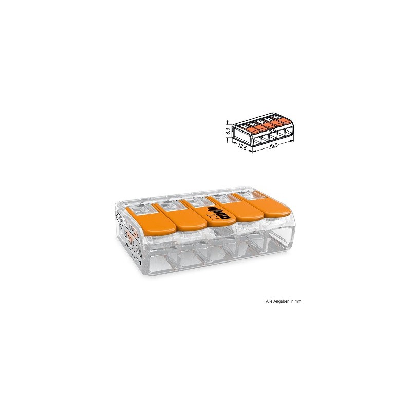 Sicheres und einfaches Verbinden von 5 Pol Kabeln/Leitern. Komfort Verbindungsklemmen mit Betätigungshebel. Ideal zum schnellen Anschliessen von Lampen, Leuchten oder anderen Elektroinstallationen. Installation von ein-, fein- und mehrdrähtiger Leiter. Komfortabler Leiteranschluss von 0.14 bis 4.00 mm². Befestigungsadapter für normgerechte Installationen. Verbindungsklemmen "Compact-5", mit Hebel, 0.14-4mm², Für die perfekte Elektro-Installation, 5 Leiter/polig, für 5 Leiter von 0.14-4mm Ø.