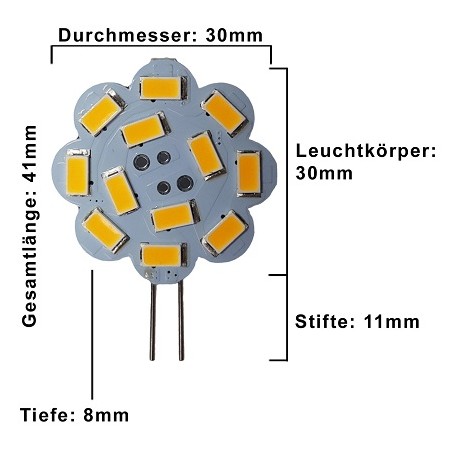 Diese tolle und genialen 1.8W dimmbare G4 und GU4 LED-Leuchtmittel mit dem Stiftsockel ist speziell für den Niederspannungseinsatz (12V/24V AC/DC) konzipiert worden (Fahrzeuge, Camping, Solar, Hobby usw.). Je nach Ausführung, Lichtfarbe und Leistung eignen sich die 10-30V G4 Leuchtmittel mit GU4 Sockel für den universellen Einsatz im Innen- oder Aussenbereich. Sind teilweise sogar dimmbar. LED-Stiftsockellampe G4, 12V/24V AC/DC, 1.8W, dimmbar, 10-30V, 3000K, 210Lm, 41x30mm, Ersatz 23W, 12 LEDs, 4.1 x 3.0 x 0.7, Kunststoff/Metall, Trafo, Dimmer müssen