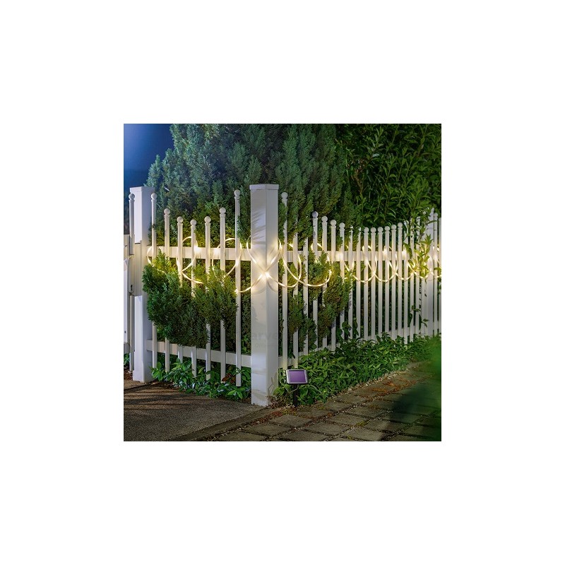 Dieser 12m lange tolle, universeller und warmweisser LED Lichtschlauch mit 100 LEDS wird inkl. Panel/Akku und Erdspiess/Wandbefestigung geliefert.