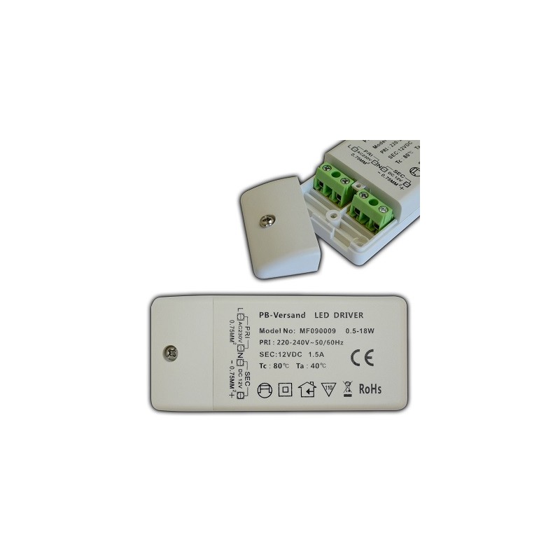 Mit diesem 18W 12V/DC LED Trafo oder Treiber können Sie unterschiedliche LED-Leuchtmittel und Installationen fachgerecht installieren. Überspannungs - sowie Kurzschlussschutz. Ausgangsleistung: 18 Watt LED DC-Treiber/Trafo, 12V DC, 0.5-18W, 1.5A, rechteckige Bauform, Konstantspannung, 9.2 x 4.2 x 1.9, Kunststoff. MM geprüft