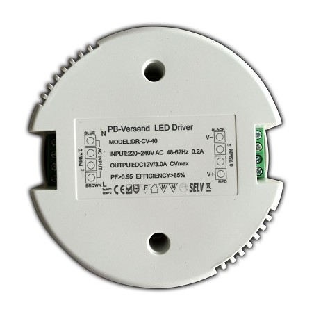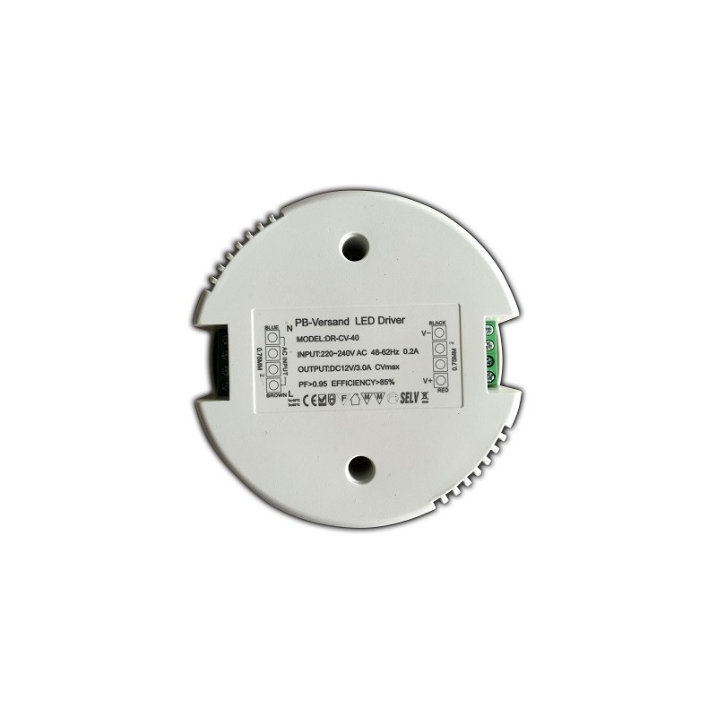 Mit diesem platzsparenden 40W 12V/DC LED Trafo oder Treiber können Sie unterschiedliche LED-Leuchtmittel und Installationen fachgerecht installieren. Einfacher Anschluss über Schraubterminals (Eingang/Ausgang). Überspannungs - sowie Kurzschlussschutz. Ausgangsleistung: 36 Watt. LED DC-Treiber/Trafo, 12V DC, 3A, 1-40W, runde Bauform, Konstantspannung, 10 x 3.0, weiss, Kunststoff, Triac Trafo, dimmbar.