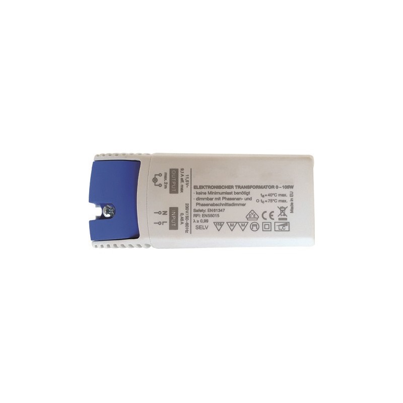 Mit diesem dimmbaren 12V/AC, 0-105W LED Trafo oder Treiber können Sie unterschiedliche LED-Leuchtmittel und Installationen fachgerecht installieren. Leerlaufsicher und hat einen Softstart. Dimmbares Einbau-Vorschaltgerät/Transformator 0W-70W für Innenbereich mit der Ausgangsspannung 11.5V AC. Dieses AC Netzgerät/Treiber enthält Überhitzungsschutz, Kurzschlussschutz und Überlastschutz. LED AC-Treiber/Trafo "ETZ105", 12V AC, 0-105W, dimmbar, 230V/12V, rechteckige Bauform, Konstantspannung, 10.8 x 4.4 x 3.3, grau, Kunststoff, L,C dimmbar.